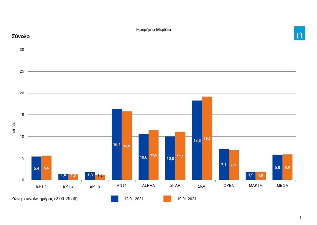 Σύμφωνα με τις μετρήσεις της Nielsen για την Τρίτη 19 Ιανουαρίου, πρώτος στον πίνακα της τηλεθέασης ήταν ο ΣΚΑΪ με 19,2%, δεύτερος ο ΑΝΤ1 με 15,8%, τρίτος ο Alpha με 11,5% και τέταρτο το Star με 11,1%.