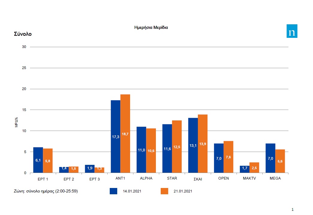 Ο ΑΝΤ1 ήταν πρώτο κανάλι στην τηλεθέαση την Πέμπτη 21 Ιανουαρίου, καθ’ όλη τη διάρκεια της ημέρας στο δυναμικό κοινό 18-54, με 19,2% και 6,1 μονάδες μπροστά από τον ανταγωνισμό.