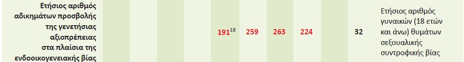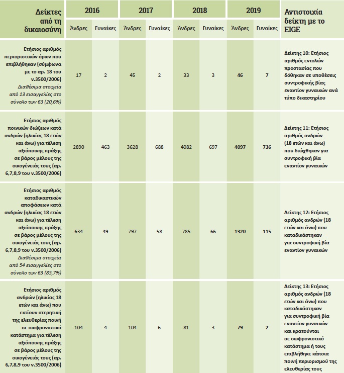 Σύμφωνα με τα στοιχεία για τους δείκτες που έχουν προταθεί από το Ευρωπαϊκό Ινστιτούτο για την Ισότητα των Φύλων (EIGE), το 2019 διώχθηκαν ποινικά 4.097 άνδρες για ενδοοικογενειακή βία. Το ίδιο έτος καταδικάστηκαν 1.320, ενώ 79 εκτίουν ποινή πίσω από τα κάγκελα της φυλακής.
