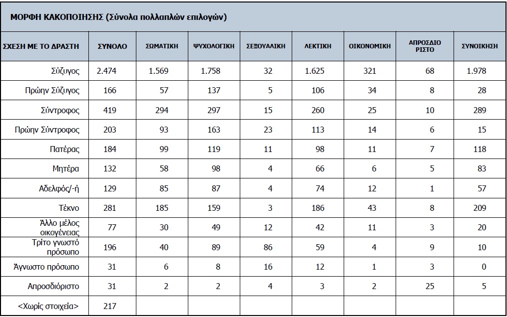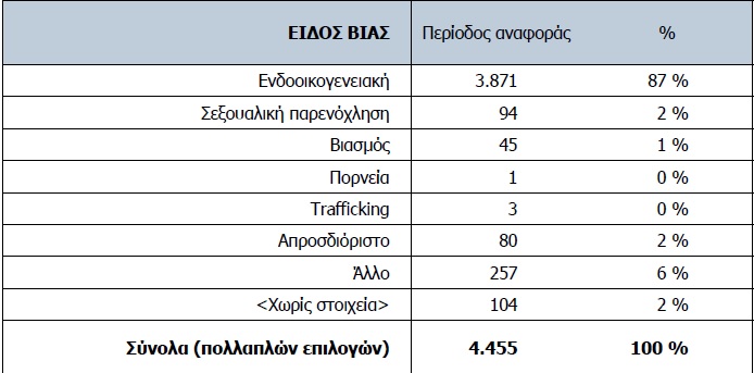 Από τα στοιχεία των κλήσεων της τηλεφωνικής γραμμής υποστήριξης εθνικής εμβέλειας SOS για την περίοδο από τη 1 Ιανουαρίου του 2020 έως τις 31 Δεκεμβρίου του 2020, προκύπτει ότι η υπηρεσία δέχθηκε 94 κλήσεις για σεξουαλική παρενόχληση 45 για βιασμό και 3.871 για ενδοοικογενειακή βία.