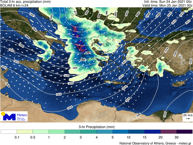 Στους προγνωστικούς χάρτες που ακολουθούν παρουσιάζονται η κατανομή των φαινομένων και οι άνεμοι που θα πνέουν νωρίς το βράδυ της Κυριακής 24/01 και τις πρώτες μεταμεσονύκτιες ώρες προς Δευτέρα 25/01. Μεγάλα ύψη βροχής αναμένονται εκ νέου σε περιοχές της Δυτικής Ελλάδας, όπου απαιτείται μεγάλη προσοχή.
