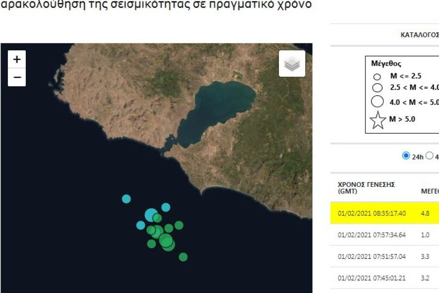 Και νέα σεισμική δόνηση σημειώθηκε στις 10:35 ώρα Ελλάδας, στον θαλάσσιο χώρο ανοιχτά της Λέσβου, σύμφωνα με ανακοίνωση του Γεωδυναμικού Ινστιτούτου. Ειδικότερα, στις 10:35 ώρα Ελλάδας, το σεισμολογικό δίκτυο κατέγραψε σεισμική δόνηση μεγέθους 4.8 Ρίχτερ, σε απόσταση 232 χλμ, α/βα της Αθήνας.