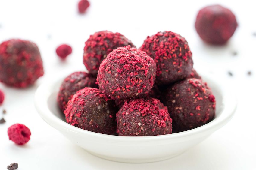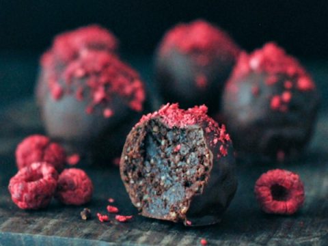 Ρολάρετε με τα χέρια σας ένα γεμάτο κουταλάκι του γλυκού από το μίγμα σε μπαλάκι και κυλήστε το στη σκόνη σμέουρου. Βάλτε τα τρουφάκια σε μια πιατέλα με αντικολλητικό χαρτί και τοποθετήστε τα στο ψυγείο μέχρι να τα σερβίρετε!