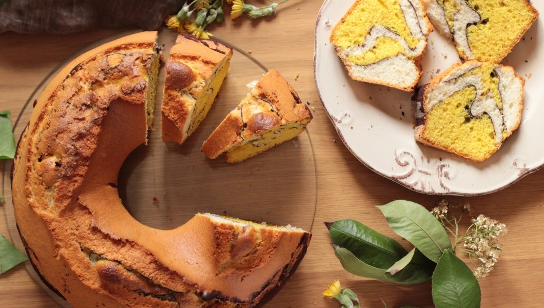 Για το εφέ καμηλοπάρδαλης, ρίξτε στη φόρμα το μισό κίτρινο μίγμα και κοσκινίστε ομοιόμορφα με κακάο.