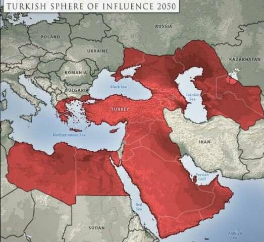 Στον χάρτη του Stratfor, εμφανίζονται ως «κόκκινες» οι χώρες που θα βρίσκονται κάτω από την επιρροή της Τουρκίας. Ανάμεσα σε αυτές είναι η Αρμενία, η Ελλάδα, τα ΗΑΕ, το Ομάν, το Μπαχρέιν, η Κύπρος, η Γεωργία, το Αζερμπαϊτζάν, η Αμπχαζία, η Λίβανος, η Συρία, η Υεμένη, το Ιράκ, το Κουβέιτ, η Αίγυπτος, η Λιβύη, χώρες της πρώην Σοβιετικής Ένωσης, καθώς και περιοχές της νότιας Ρωσίας, συμπεριλαμβανομένης της Κριμαίας, του Κουμπάν, της περιοχής του Ροστόφ και των δημοκρατιών του Βόρειου Καυκάσου.