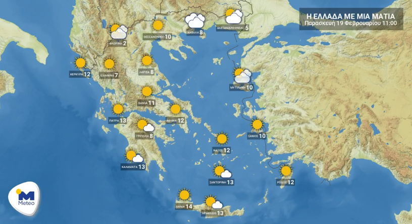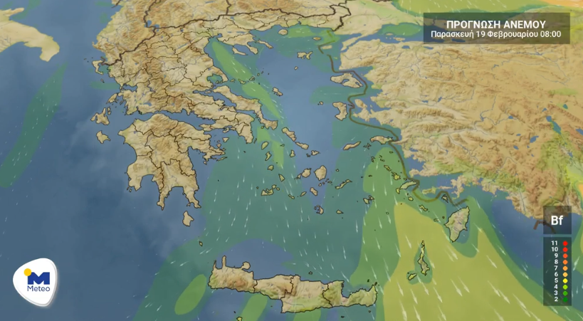 Γενικά καλός καιρός αναμένεται την Παρασκευή 19 Φεβρουαρίου 2021 με τη θερμοκρασία να μη σημειώνει κάποια αξιόλογη μεταβολή και τους ανέμους να πλέουν τοπικά έως 6 μποφόρ στο Αιγαίο.