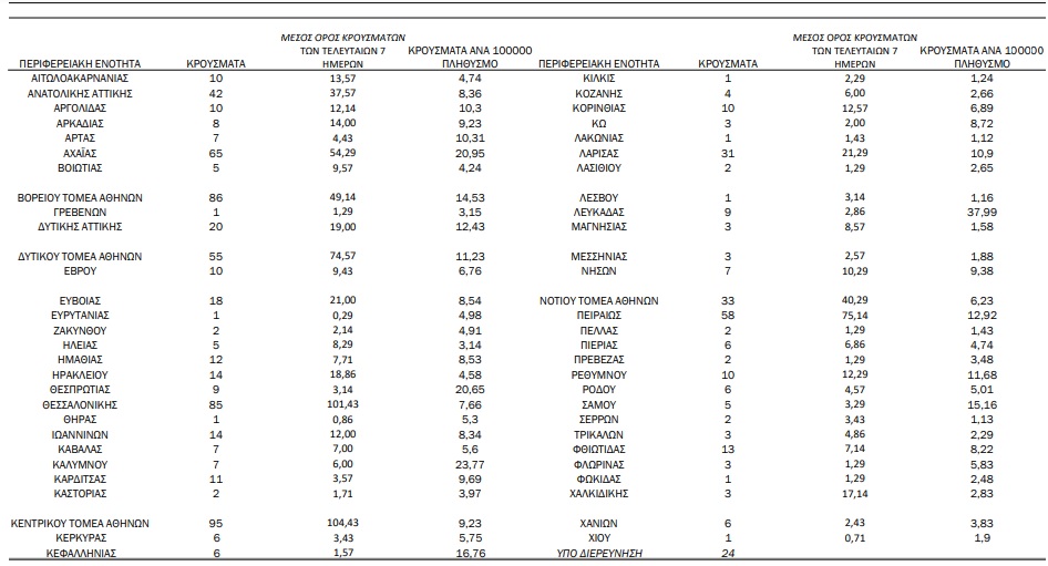 Με βάση τα επιβεβαιωμένα κρούσματα των τελευταίων 7 ημερών, 43 θεωρούνται σχετιζόμενα με ταξίδι από το εξωτερικό και 2.399 είναι σχετιζόμενα με ήδη γνωστό κρούσμα.