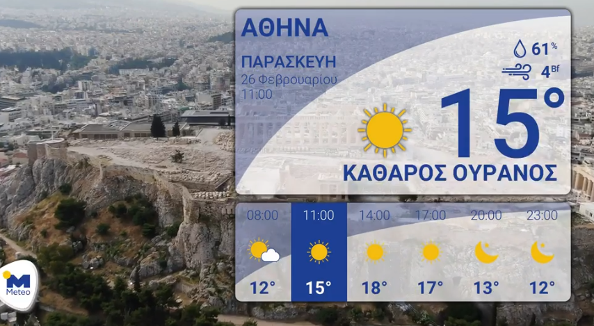 Καλός και ζεστός καιρός αναμένεται την Παρασκευή 26 Φεβρουαρίου 2021. Θερμοκρασία σε υψηλά για την εποχή επίπεδα. Βόρειοι άνεμοι έως 7 μποφόρ στο Αιγαίο με σταδιακή εξασθένηση.