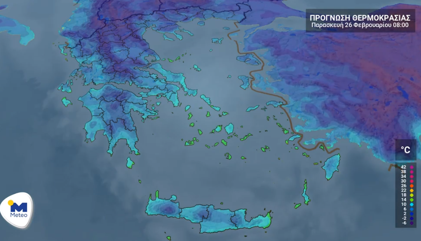 Σύμφωνα με το meteo, η θερμοκρασία στη Δυτική Μακεδονία θα κυμανθεί από 0 έως 15 βαθμούς Κελσίου, στην υπόλοιπη Μακεδονία και στη Θράκη από 2 έως 18, στη Θεσσαλία και στην Ανατολική Στερεά από 5 έως 18, στην Ήπειρο και στη Δυτική Στερεά από 6 έως 20, στην Πελοπόννησο από 10 έως 21, στα νησιά του Ιονίου από 10 έως 20, στα νησιά του Βορείου και Ανατολικού Αιγαίου από 8 έως 19, στις Κυκλάδες από 11 έως 17, στα Δωδεκάνησα από 7 έως 19 και στην Κρήτη από 10 έως 17 βαθμούς Κελσίου.
