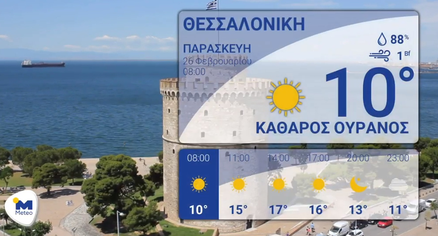 Στη Θεσσαλονίκη αναμένεται ηλιοφάνεια. Οι άνεμοι θα πνέουν από μεταβαλλόμενες διευθύνσεις έως 2 μποφόρ. Η ορατότητα έως το πρωί και προς το τέλος του εικοσιτετράωρου να είναι τοπικά περιορισμένη. Οι συγκεντρώσεις σκόνης στην ατμόσφαιρα θα είναι σχετικά αυξημένες. Η θερμοκρασία στο κέντρο της πόλης θα κυμανθεί από 10 έως 17 βαθμούς.