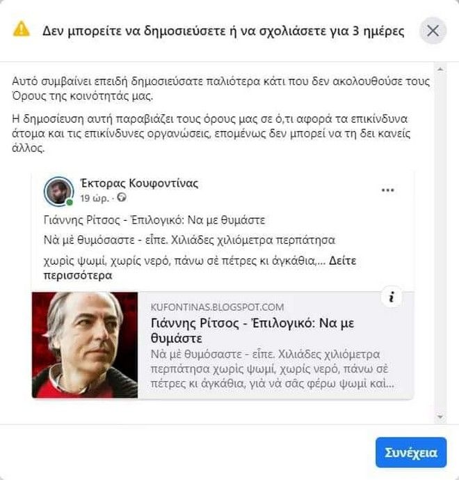 Με ανάρτησή του στον προσωπικό του λογαριασμό του στο Facebook ο γιος του Δημήτρη Κουφοντίνα, Έκτορας υποστηρίζει πως “το Facebook ενοχλήθηκε από ένα ποίημα του Γιάννη Ρίτσου”, το οποίο ο ίδιος είχε αναρτήσει στο κοινωνικό μέσο δικτύωσης και “τον τιμώρησε”, όπως επισημαίνει, κατεβάζοντας το προφίλ του: