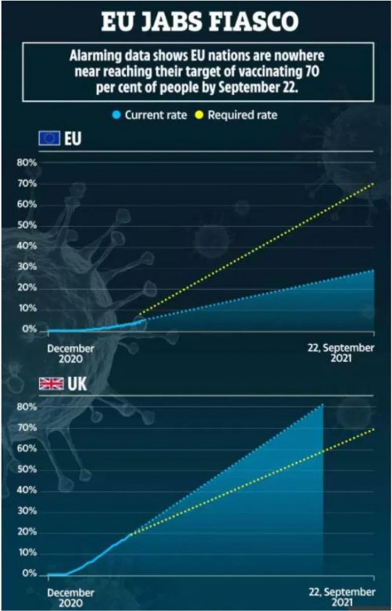 Ο στόχος που τέθηκε τον Δεκέμβριο του 2020, όταν ξεκίνησαν οι εμβολιασμοί κατά του νέου κορωνοϊού, ήταν τον Σεπτέμβριο του 2021 να έχει εμβολιαστεί το 70% του γενικού πληθυσμού. Σύμφωνα με τον ρυθμό που εξελίσσεται μέχρι σήμερα ο εμβολιασμός στις ευρωπαϊκές χώρες, ο στόχος του 70% είναι αδύνατον να επιτευχθεί. Μάλιστα, αν η διαδικασία συνεχιστεί με τον ίδιο ρυθμό, το ποσοστό ανοσίας θα αγγίξει μόλις και μετά βίας το 30% στην Ευρωπαϊκή Ένωση.