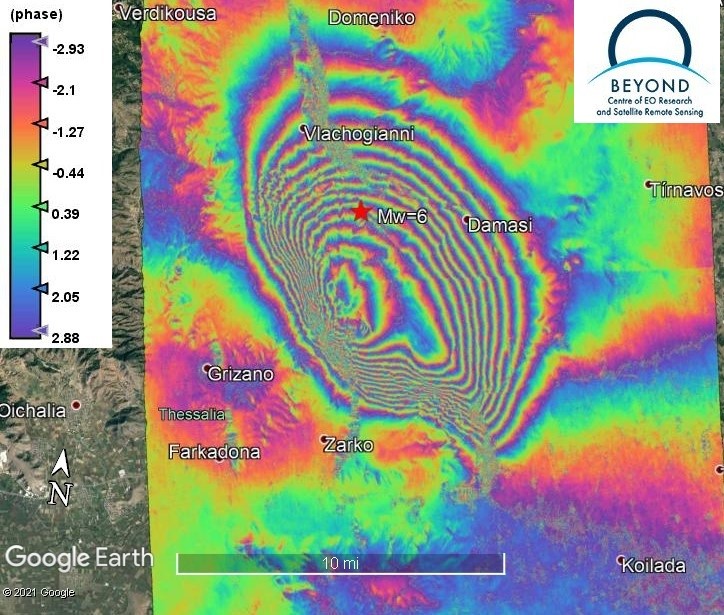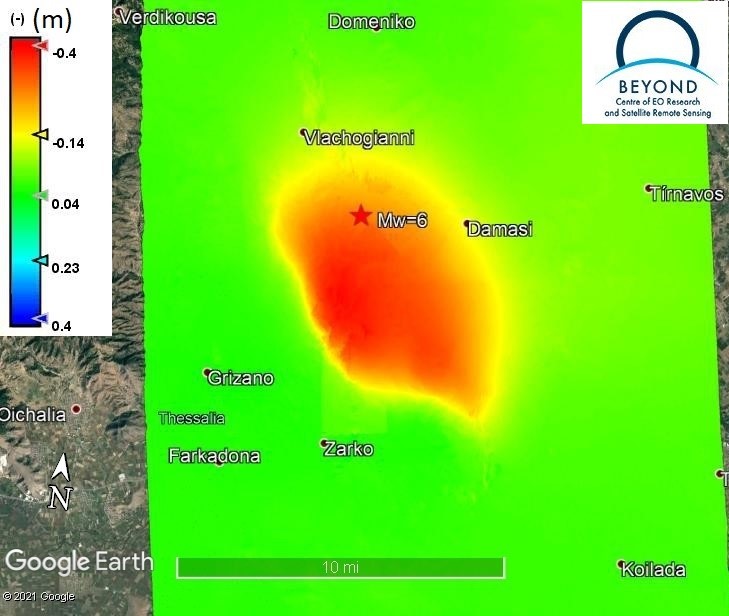 Η υπηρεσία geObservatory του Κέντρου Επιστημών Παρατήρησης της Γης και Δορυφορικής Τηλεπισκόπησης BEYOND του Ινστιτούτου Αστρονομίας, Αστροφυσικής και Διαστημικών Εφαρμογών του Εθνικού Αστεροσκοπείου Αθηνών, ενεργοποιήθηκε λίγα δευτερόλεπτα μετά τον σεισμό. Το Hellenic Mirror Site συνέλεξε εικόνες ραντάρ συνθετικού ανοίγματος SAR Sentinel-1A της 25ης Φεβρουαρίου 2021 και 3ης Μαρτίου 2021 (Ανοδική τροχιά δορυφόρου, 102), για τη δημιουργία του συμβολογραφήματος, όπου καταγράφεται η εδαφική παραμόρφωση, στην ευρύτερη περιοχή γύρω από το επίκεντρο του σεισμού.