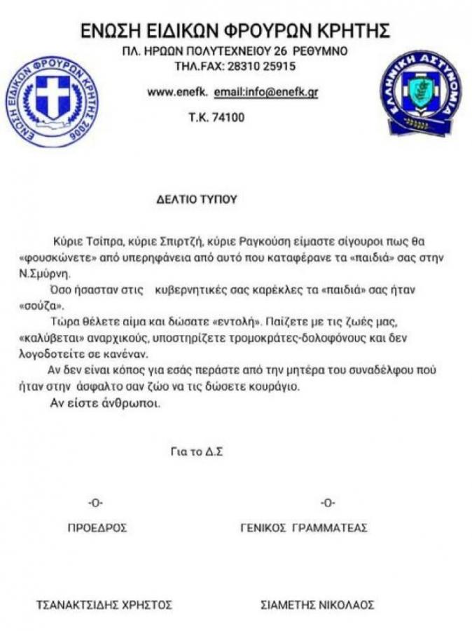 Θορυβήθηκε η ΕΛ.ΑΣ. από ανακοίνωση που εκδόθηκε το βράδυ της Τετάρτης από την Ένωση Ειδικών Φρουρών Κρήτης κατά του ΣΥΡΙΖΑ.