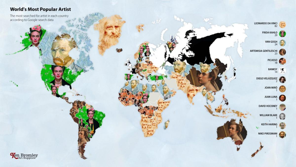 Έχοντας αυτό στον νου, η ομάδα ερευνητών στην Ken Bromley Art Supplies θέλησε να εντοπίσει ποιοι καλλιτέχνες υπήρξαν το συχνότερο αντικείμενο αναζήτησης το 2020 και ποιος ήταν ο πιο δημοφιλής σε κάθε χώρα καθ’ όλη τη διάρκεια της πανδημίας.