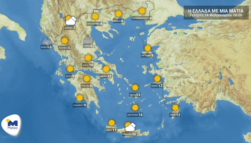 Βροχές και τοπικές καταιγίδες θα σημειωθούν σύμφωνα με το Meteo, σε Ανατολικό Αιγαίο, Δωδεκάνησα, τοπικές βροχές και χιονοπτώσεις στα ορεινά και ημιορεινά της Ανατολικής Μακεδονίας, Θράκης, τις πρωινές ώρες, στα υπόλοιπα τμήματα ηλιοφάνεια με παροδικές νεφώσεις, τοπικές βροχές στα δυτικά και στα νότια μετά το μεσημέρι καταιγίδες, αρχικά θυελλώδεις άνεμοι δυτικών διευθύνσεων με βαθμιαία εξασθένηση, θερμοκρασία σε μικρή πτώση.