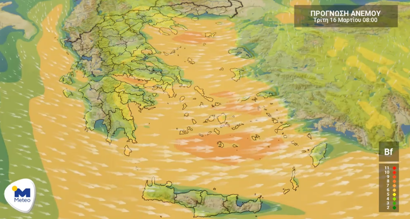 Οι άνεμοι θα πνέουν στο Αιγαίο γενικά από δυτικές διευθύνσεις αρχικά ισχυροί έως σχεδόν θυελλώδεις 6-7 μποφόρ και τοπικά στο Βόρειο Αιγαίο θυελλώδεις 8 μποφόρ με βαθμιαία εξασθένηση, ενώ στο Ιόνιο από βορειοδυτικές διευθύνσεις μέτριοι 4-5 μποφόρ.