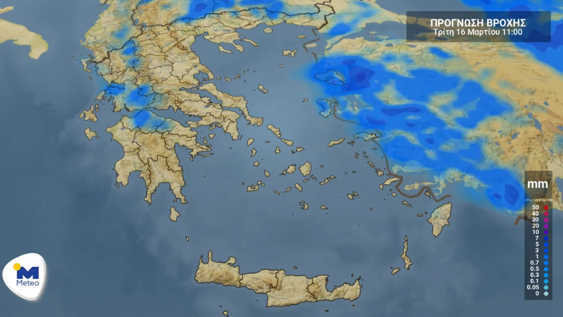 Για σήμερα, Τρίτη 16 Μαρτίου 2021 προβλέπονται αρχικά στα νησιά του Ανατολικού Αιγαίου και στα Δωδεκάνησα βροχές και τοπικές καταιγίδες και στην Ανατολική Μακεδονία και στη Θράκη τοπικές βροχές και χιόνια στα ορεινά και ημιορεινά, με βελτίωση στη συνέχεια. Στις υπόλοιπες περιοχές αναμένεται ηλιοφάνεια με νεφώσεις παροδικά αυξημένες, τοπικές βροχές στα δυτικά και παροδικές χιονοπτώσεις στα ορεινά και ημιορεινά τμήματα της Ηπείρου. Μετά το μεσημέρι στη Νότια Πελοπόννησο, στις Κυκλάδες και στην Κρήτη αναμένονται βροχές και τοπικές καταιγίδες, ενώ τις βραδινές ώρες τα φαινόμενα θα επηρεάσουν τα Δωδεκάνησα.