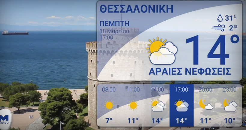 Ηλιοφάνεια με αραιές νεφώσεις παροδικά πυκνότερες περιμένουμε την Πέμπτη στη Θεσσαλονίκη. Η θερμοκρασία θα κυμανθεί από 4 έως 14 βαθμούς Κελσίου. Οι άνεμοι στο Θερμαϊκό θα πνέουν από βορειοδυτικές διευθύνσεις μέτριοι 4-5 μποφόρ, όπου μετά το μεσημέρι θα στραφούν πρόσκαιρα σε νότιους ασθενείς έως σχεδόν μέτριους 3-4 μποφόρ.