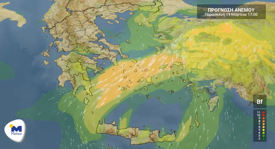 Οι άνεμοι θα πνέουν στο Βόρειο Αιγαίο από βόρειες διευθύνσεις μέτριοι 5 μποφόρ και στο υπόλοιπο Αιγαίο από νοτιοδυτικές διευθύνσεις μέτριοι έως ισχυροί 5-6 μποφόρ και πρόσκαιρα τις πρωινές ώρες στο Κεντρικό Αιγαίο σχεδόν θυελλώδεις 7 μποφόρ, με σημαντική εξασθένηση στη συνέχεια. Στο Ιόνιο οι άνεμοι θα πνέουν κυρίως από βόρειες διευθύνσεις ασθενείς έως σχεδόν μέτριοι 3-4 μποφόρ.