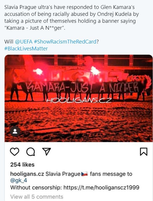 Οι οπαδοί της Σλάβια Πράγας πήραν το μέρος του παίκτη της ομάδας τους, Όντρεϊ Κούντελα και με ένα εμετικό πανό τα έβαλαν τον Γκλεν Καμαρά της Ρέιντζερς.
