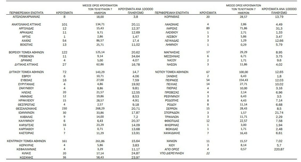 Στο Λεκανοπέδιο καταγράφηκαν: 101 κρούσματα στην Ανατολική Αττική, 122 στον Βόρειο Τομέα Αθηνών, 27 στη Δυτική Αττική, 72 στον Δυτικό Τομέα Αθηνών, 161 στον Κεντρικό Τομέα Αθηνών, τρία στα νησιά, 67 στο Νότιο Τομέα Αθηνών και 54 στον Πειραιά.