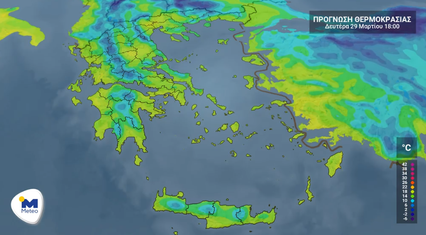 Η θερμοκρασία στη Δυτική Μακεδονία θα κυμανθεί από 0 έως 15 βαθμούς Κελσίου, στην υπόλοιπη Μακεδονία και στη Θράκη από 4 έως 19, στην Ήπειρο από 4 έως 18, στα υπόλοιπα ηπειρωτικά από 5 έως 20, στα νησιά του Ιονίου από 8 έως 19, στα νησιά του Βορείου και Ανατολικού Αιγαίου από 6 έως 19, στις Κυκλάδες και στην Κρήτη από 6 έως 18 και στα Δωδεκάνησα από 10 έως 18 βαθμούς Κελσίου.
