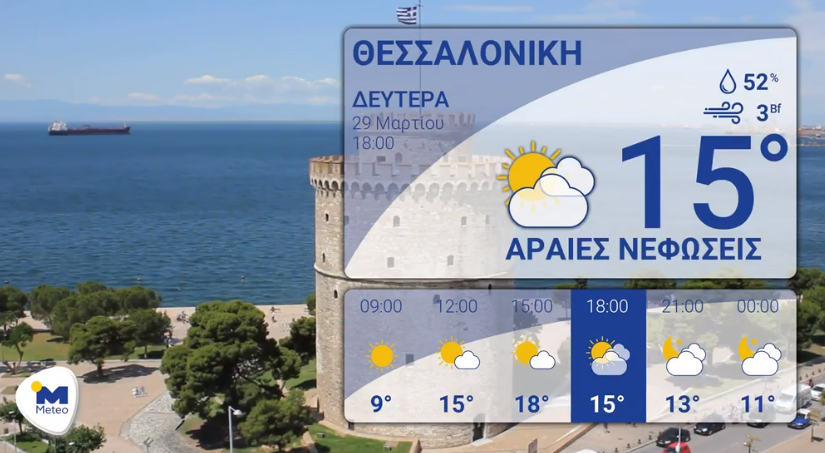 Στη Θεσσαλονίκη αναμένονται αραιές νεφώσεις που κατά διαστήματα θα είναι πυκνότερες. Οι άνεμοι θα πνέουν από βόρειες διευθύνσεις έως 3 μποφόρ όμως το μεσημέρι και απόγευμα θα στραφούν σε βορειοδυτικούς 2 έως 4 μποφόρ. Η θερμοκρασία στο κέντρο της πόλης θα κυμανθεί από 9 έως 19 βαθμούς Κελσίου. Η ορατότητα έως το πρωί θα είναι τοπικά περιορισμένη.