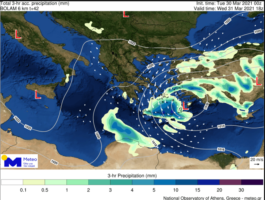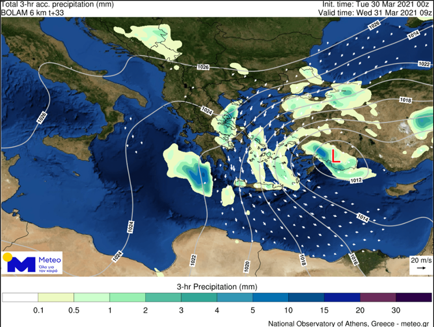 Ο καιρός το επόμενο διήμερο προβλέπεται άστατος, καθώς βαρομετρικό χαμηλό στο νοτιοανατολικό Αιγαίο, αναμένεται να επηρεάσει τον καιρό της χώρας το διήμερο Τετάρτη και Πέμπτη με βροχές και καταιγίδες στα ανατολικά και νότια ηπειρωτικά, στις Κυκλάδες, στην Κρήτη και στα Δωδεκάνησα, φαινόμενα που κατά τόπους θα είναι ισχυρά.