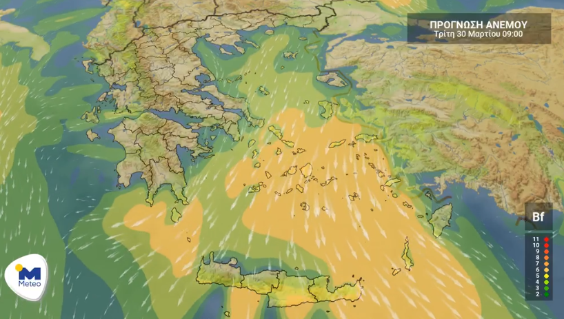 Οι άνεμοι θα πνέουν στο Αιγαίο από βόρειες διευθύνσεις με εντάσεις έως 6 μποφόρ, ενισχυόμενοι βαθμιαία σε πολλές περιοχές στα 7 μποφόρ και ενδεχομένως τοπικά στα ανατολικά και νοτιοανατολικά πελάγη πρόσκαιρα 8. Στο Ιόνιο θα επικρατήσουν βορειοανατολικοί άνεμοι με εντάσεις έως 5 μποφόρ.