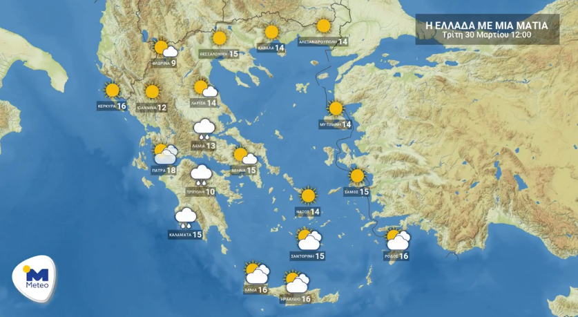 Άστατος θα είναι ο καιρός σήμερα, Τρίτη 30 Μαρτίου 2021 με βροχές και σποραδικές καταιγίδες κυρίως στα κεντρικά, ανατολικά και νότια. Έντονα θα είναι τα φαινόμενα στην Πελοπόννησο ενώ οι βόρειοι άνεμοι θα πνέουν από 6-8 μποφόρ στο Αιγαίο. Μικρή πτώση θα σημειώσουν οι μέγιστες θερμοκρασίες.