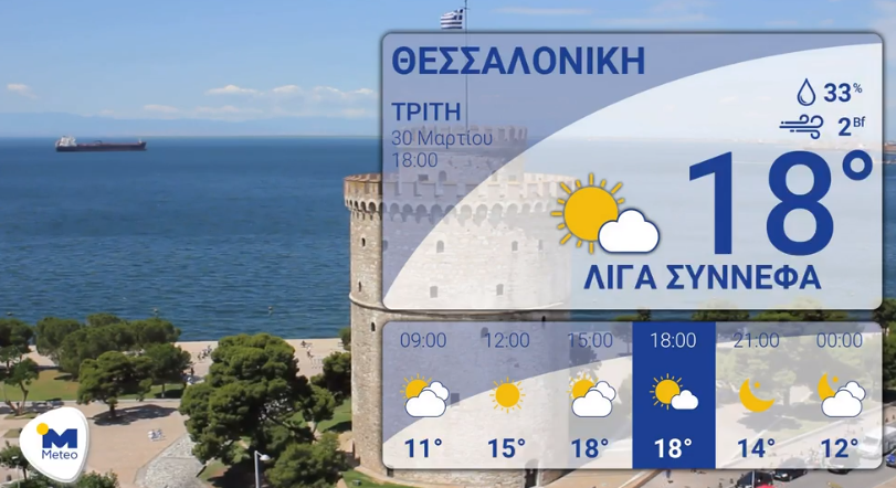Στη Θεσσαλονίκη περιμένουμε κατά περιόδους αυξημένες νεφώσεις, με πιθανότητα βροχής μετά το μεσημέρι. Οι άνεμοι θα πνέουν βόρειοι βορειοδυτικοί με εντάσεις έως 4 μποφόρ ασθενείς. Η θερμοκρασία στην πόλη της Θεσσαλονίκης θα κυμανθεί από 7 έως 18 βαθμούς, αλλά περιφερειακά της πόλης οι ελάχιστες θα είναι 3-4 βαθμούς χαμηλότερες.