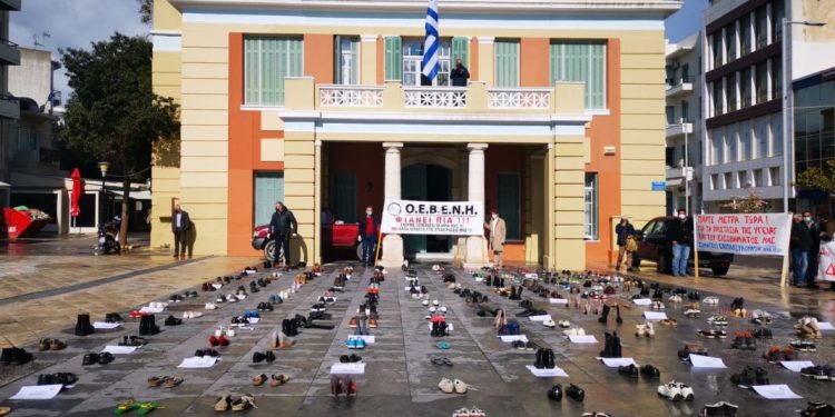 Στις 10 το πρωί, τοποθέτησαν υποδήματα στην πλατεία Ελευθερίας σε ένδειξη διαμαρτυρίας για την τραγική κατάσταση στην οποία έχει περιέλθει ο κλάδος τους.