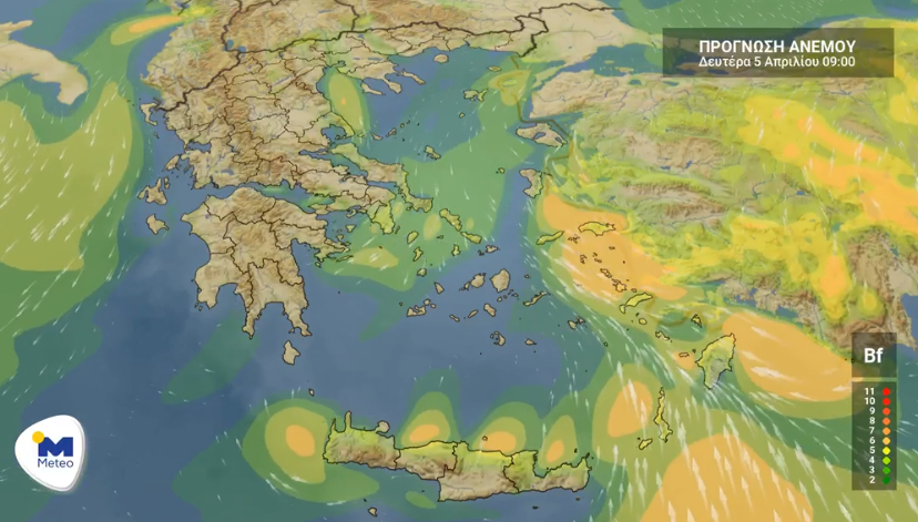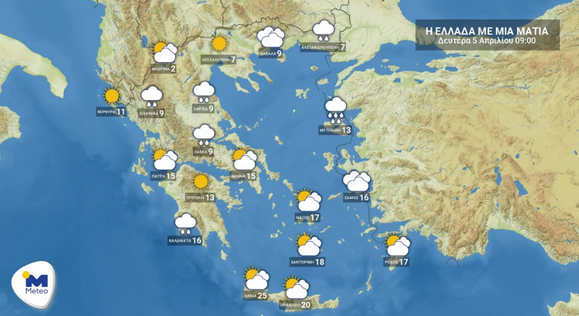 Τοπικές λασπoβροχές και σποραδικές καταιγίδες αναμένονται σήμερα, Δευτέρα 5 Απριλίου 2021. Οι θερμοκρασίες θα είναι υψηλές, ιδιαίτερα στην Κρήτη, ενώ οι άνεμοι θα πνέουν έως 6 μποφόρ και στο Νότιο Αιγαίο έως 7 μποφόρ. Αυξημένες θα είναι επίσης και οι συγκεντρώσεις αφρικανικής σκόνης.