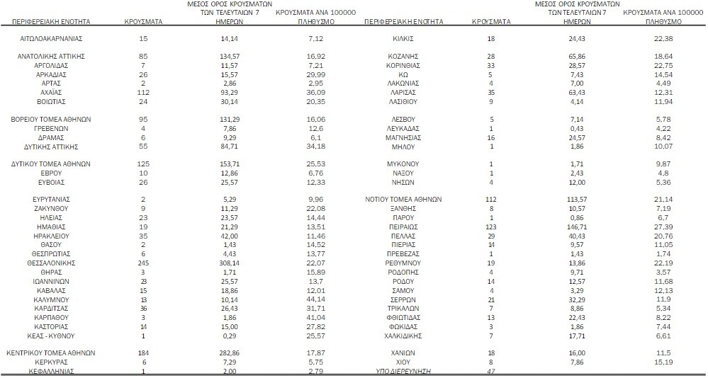 Στην Αττική εντοπίστηκαν 783 νέα κρούσματα, εκ των οποίων τα 184 στο κέντρο της Αθήνας, ενώ 245 νέες μολύνσεις καταγράφηκαν στη Θεσσαλονίκη και 112 στην Αχαΐα.