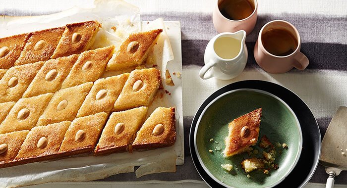 Ισιώνουμε την επιφάνεια και με ένα μαχαίρι, το χαράσσουμε σε ρόμβους ή παραλληλόγραμμα, μέχρι τον πάτο του ταψιού. Σε κάθε ρόμβο, αν θέλουμε, βάζουμε από ένα αμύγδαλο.
