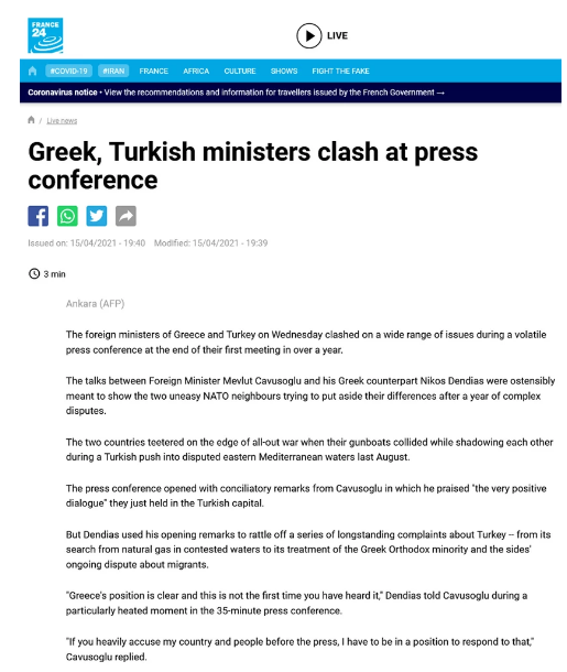 «Οι υπουργοί Εξωτερικών Ελλάδας και Τουρκίας αντάλλαξαν κατηγορίες για ευρύ φάσμα θεμάτων κατά τη διάρκεια μιας ταραχώδους συνέντευξης Τύπου στο τέλος της πρώτης συνάντησής τους εδώ και πάνω από έναν χρόνο» αναφέρει.