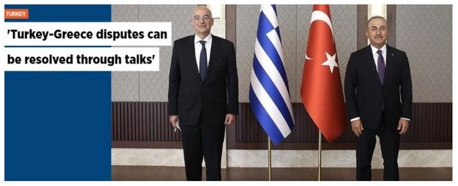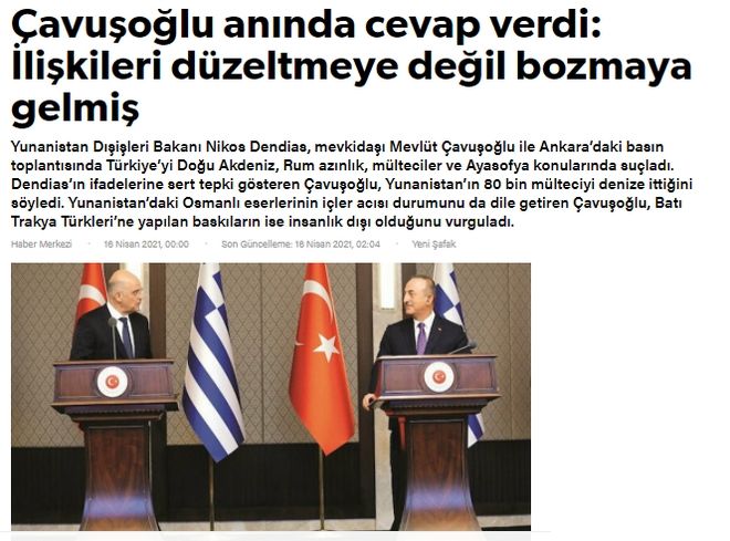 Η φιλοκυβερνητική εφημερίδα Yeni Safak τιτλοφορεί το άρθρο της: «Ο Τσαβούσογλου απάντησε αμέσως: (Ο Δένδια) ήρθε για να καταστρέψει τις διμερείς σχέσεις, όχι να τις διορθώσει». «Ο Έλληνας υπουργός Εξωτερικών Νίκος Δένδιας κατηγόρησε την Τουρκία για τη διαχείριση της ελληνικής μειονότητας, για το προσφυγικό και την Αγιά Σοφιά. Ο Τσαβούσογλου αντέδρασε έντονα στις δηλώσεις αυτές, και τόνισε ότι η Ελλάδα έσπρωξε 80.000 πρόσφυγες στη θάλασσα. (..) Υπογράμμισε μάλιστα ότι η καταπίεση που υφίστανται οι μουσουλμάνοι της Δυτικής Θράκης είναι απάνθρωπη.»