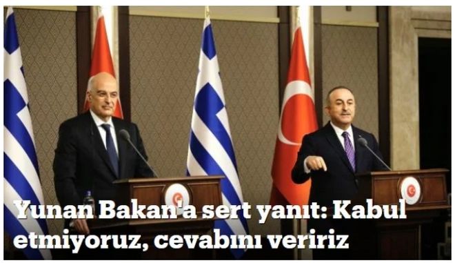 Το κρατικό TRT Haber έκανε λόγο για «σκληρή απάντηση του Τούρκου υπουργού Εξωτερικών»: «Ο Τούρκος ΥΠΕΞ έδωσε σκληρή απάντηση στις κατηγορίες που έγιναν σε βάρος της Άγκυρας (από τον Ν. Δένδια). “Δεν έκανα καμία κατηγορία σε βάρος της Ελλάδας κατά την τοποθέτησή μου (στη συνέντευξη Τύπου). Δεν γίνεται η Τουρκία να αποδεχτεί αυτές τις κατηγορίες” είπε ο Μεβλούτ Τσαβούσογλου», γράφει χαρακτηριστικά το πρακτορείο.