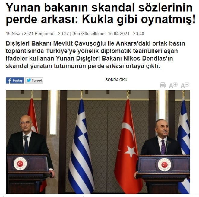 Η Vatan, έκανε λόγο για σκανδαλώδεις φράσεις του Έλληνα υπουργού Νίκου Δένδια. Στο άρθρο της που τιτλοφορείται «Το παρασκήνιο των σκανδαλωδών λέξεων του Έλληνα ΥΠΕΞ: Το χειρίστηκε σαν μαριονέτα» η τουρκική εφημερίδα σχολιάζει μεταξύ άλλων: «Παρόλο που ο Τούρκος υπουργός Εξωτερικών Μεβλούτ Τσαβούσογλου παρουσίασε διπλωματικές πρακτικές, ο κ. Δένδιας επέδειξε σκανδαλώδη συμπεριφορά.»
