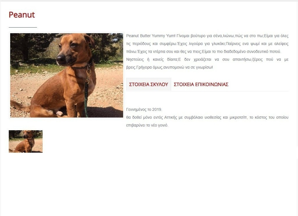 «Peanut Butter Yummy Yum! Γίνομαι βούτυρο για σένα, λιώνω, πώς να στο πω; Είμαι για όλες τις περιόδους και συμφέρω. Έχεις λιγούρα για γλυκάκι; Παίρνεις ένα ψωμί και με αλείφεις πάνω. Έχεις τα ντέρτια σου και θες να πιεις; Είμαι το πιο διαδεδομένο συνοδευτικό ποτού. Νηστεύεις ή κανείς δίαιτα; Ε δεν χρειάζεται να σου απαντήσω, ξέρεις πού να με βρεις. Γρήγορα όμως, ανυπομονώ να σε γνωρίσω!», ανέφερε η αγγελία στην ιστοσελίδα της Ζωοφιλικής Ένωσης Ηλιούπολης.