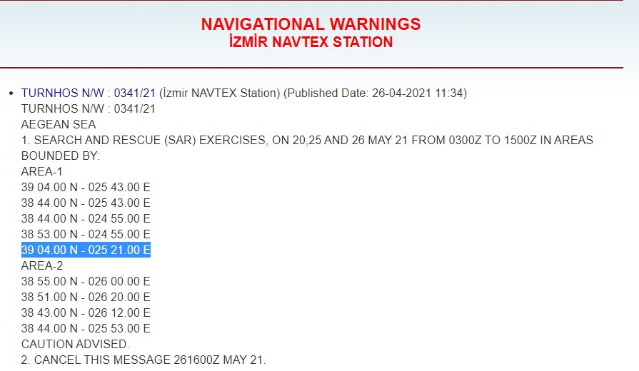 Αυτή τη φορά η Τουρκία μέσω του ναύσταθμου της Σμύρνης προγραμμάτισε, με NAVTEX, ασκήσεις έρευνας και διάσωσης στο κεντρικό και βόρειο Αιγαίο στα τέλη Μαΐου.