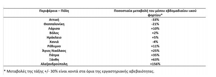 Οι οριακές μεταβολές σημειώνονται στη Θεσσαλονίκη (-21%), στο Ρέθυμνο (+11%) και στον Άγιο Νικόλαο (+25%), ενώ σταθερό παραμένει ουσιαστικά το φορτίο στις πόλεις των Χανίων, του Βόλου, του Ηρακλείου και της Λάρισας, όπου η μεταβολή του ιικού φορτίου στα λύματα κυμαίνεται από -4% έως +10%. Αντίθετα, αυξητικές τάσεις παρατηρήθηκαν σε 3 από τις 11 περιοχές που ελέγχονται από το Εθνικό Δίκτυο Επιδημιολογίας του ΕΟΔΥ, και συγκεκριμένα στην Πάτρα (+35%), στην Ξάνθη (+63%) και στην Αλεξανδρούπολη (+156%).