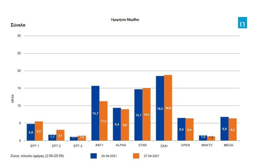Σύμφωνα με τις μετρήσεις της Nielsen για την Μεγάλη Τρίτη 27 Απριλίου, πρώτος στον πίνακα της τηλεθέασης είναι ο ΣΚΑΪ με 18,8%, δεύτερο είναι το Star με 15%, τρίτος είναι ο ΑΝΤ1 με 11,3% και τέταρτος ο Alpha με 9%.