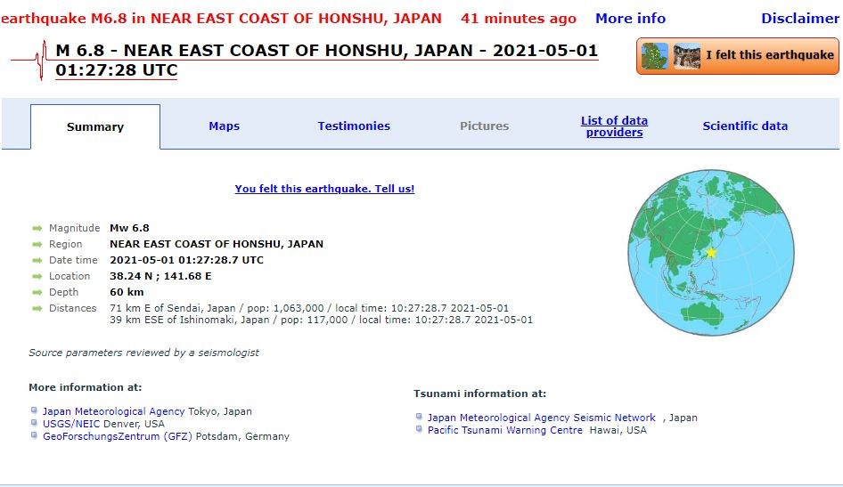 Ισχυρή σεισμική δόνηση μεγέθους 6,8 βαθμών της κλίμακας Ρίχτερ σημειώθηκε στα ανοιχτά της Ιαπωνίας.
