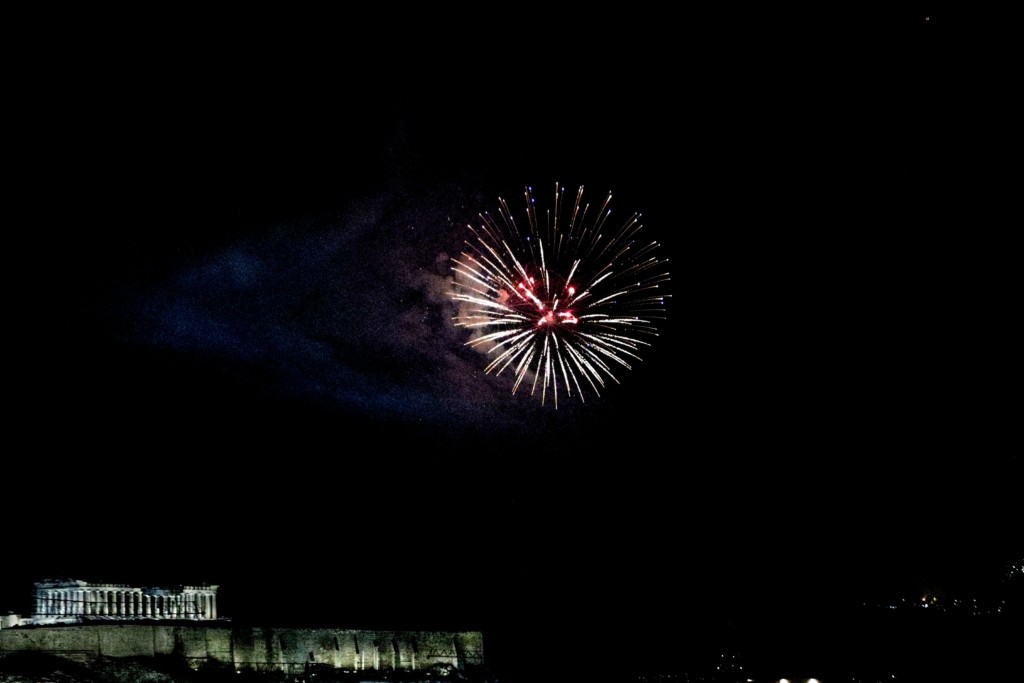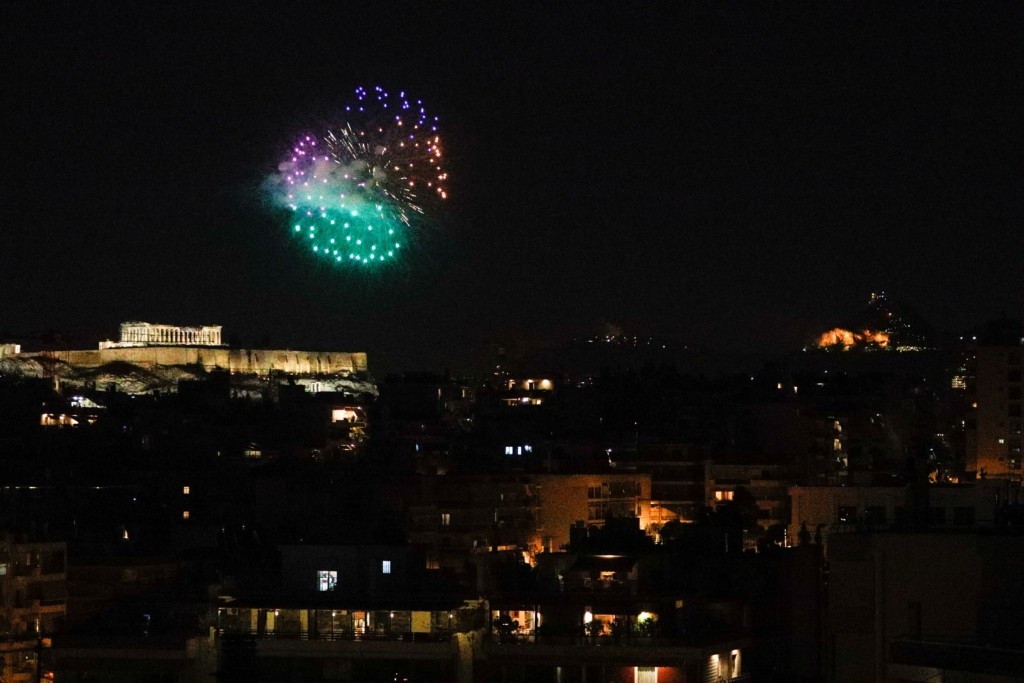 Στις 9 το βράδυ, όταν ακούστηκε το «Χριστός Ανέστη», ο ουρανός της Αθήνας γέμισε χρώματα, από τα βεγγαλικά που εκτοξεύτηκαν από την Ακρόπολη και τον Λυκαβηττό.
