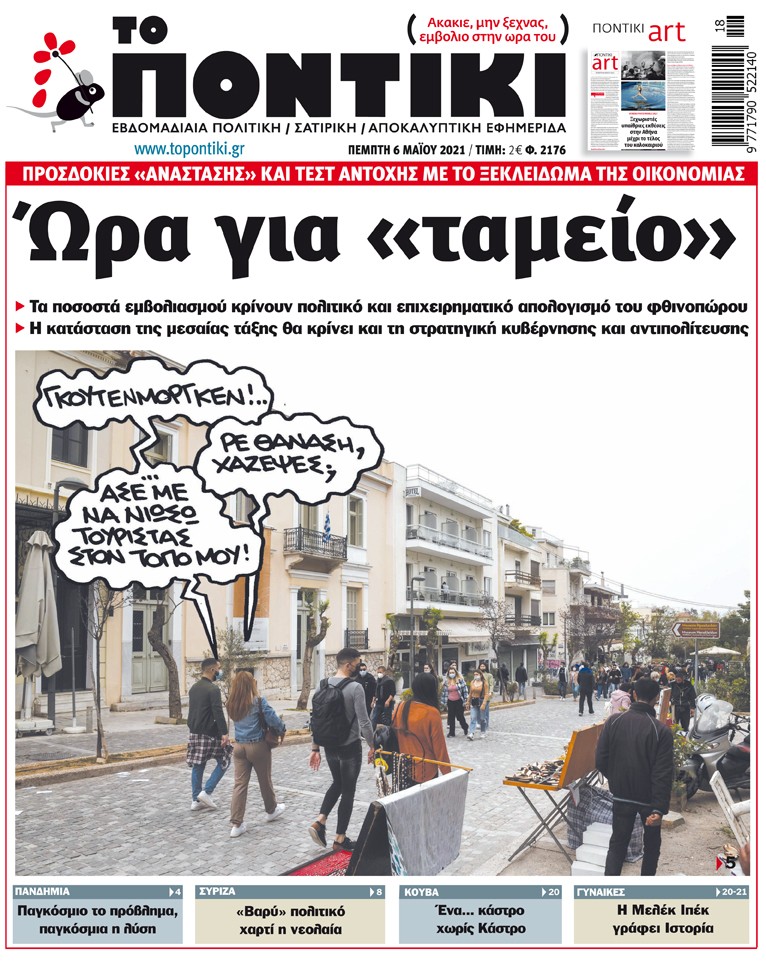 Με πρωτοσέλιδο τίτλο «Ώρα για “ταμείο”» και αναλυτικό – αποκαλυπτικό ρεπορτάζ για τις προσδοκίες «ανάστασης» και το τεστ αντοχής που φέρνει το ξεκλείδωμα της οικονομίας κυκλοφορεί το «ΠΟΝΤΙΚΙ» το πρωί της Πέμπτης.