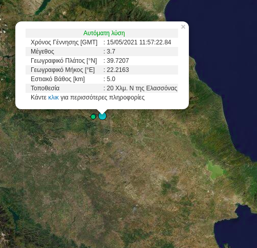 Ασθενής σεισμική δόνηση μεγέθους 3,7 βαθμών της κλίμακας Ρίχτερ σημειώθηκε το μεσημέρι του Σαββάτου κοντά στην Ελασσόνα.