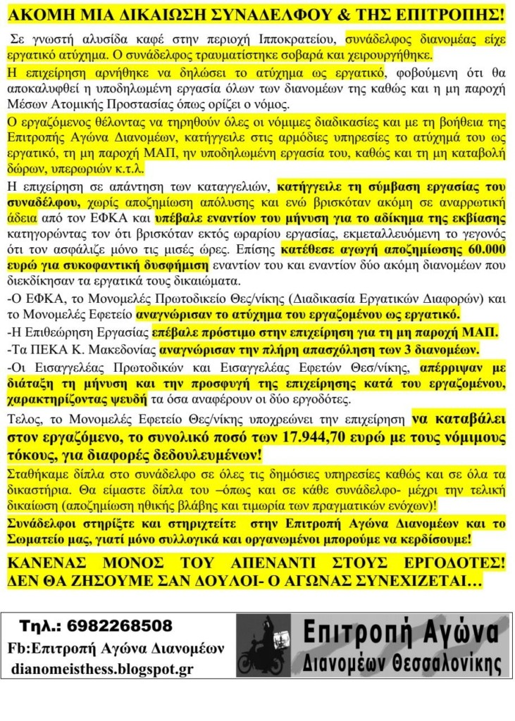 Η ανακοίνωση της επιτροπής αγώνα διανομέων Θεσσαλονίκης αναφέρει: «Σε γνωστή αλυσίδα καφέ στην περιοχή Ιπποκρατείου, συνάδελφος διανομέας είχε εργατικό ατύχημα. Ο συνάδελφος τραυματίστηκε σοβαρά και χειρουργήθηκε.