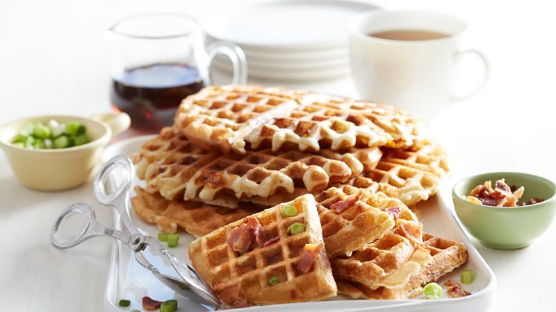 Πανεύκολες και αφράτες σπιτικές βάφλες με τυρί τσένταρ και μπέικον , για να απογειώσετε το πρωινό, για ένα γρήγορο σνακ αλλά και για όλες τις ώρες της ημέρας. Μπορείτε να τις σερβίρετε με ένα τηγανητό αυγό μάτι, με κρέμα τυρί με μυρωδικά ή οτιδήποτε άλλο επιθυμείτε.